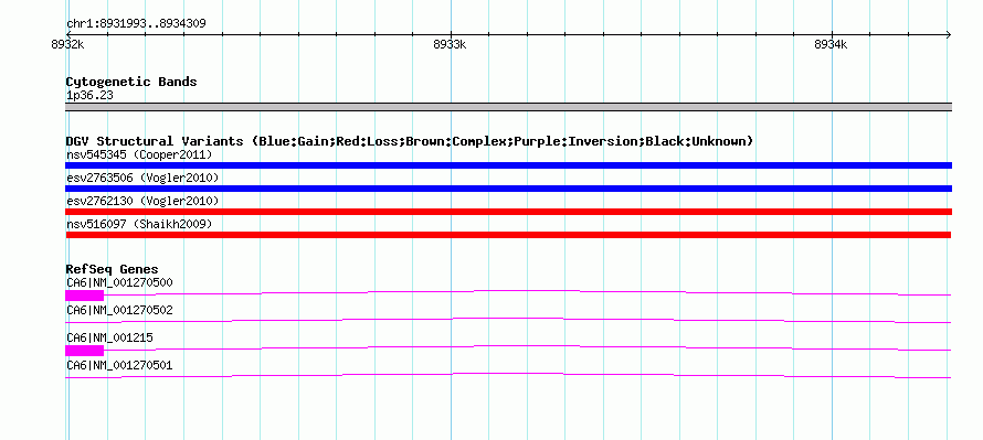 | | Variant Type | CNV loss | | Copy Number | | | Allele State | | | Allele Origin | | | Probe Count | | | Validation Flag | | | Merged Status | M | | Merged Variants | | | Supporting Variants | nssv666175, nssv660321, nssv671923, nssv671111, nssv669183, nssv660728, nssv692368, nssv660579, nssv671439 | | Samples | | | Known Genes | CA6 | | Method | SNP array | | Analysis | Sample-level CNVs | | Platform | GPL6434 | | Comments | | | Reference | Shaikh_et_al_2009 | | Pubmed ID | 19592680 | | Accession Number(s) | nsv516097