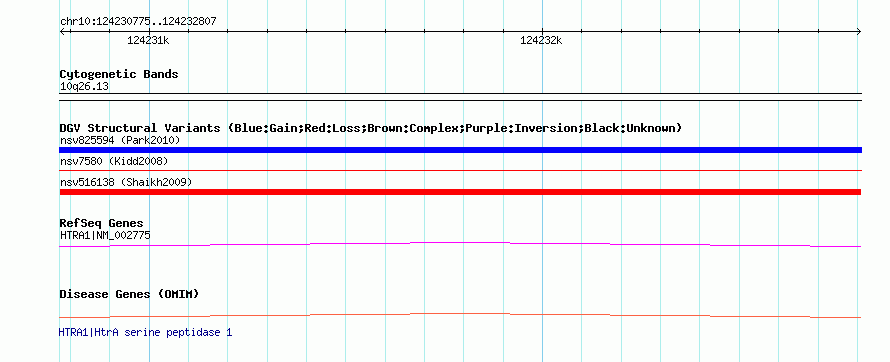 | | Variant Type | CNV loss | | Copy Number | | | Allele State | | | Allele Origin | | | Probe Count | | | Validation Flag | | | Merged Status | M | | Merged Variants | | | Supporting Variants | nssv667307, nssv666446, nssv659478 | | Samples | | | Known Genes | HTRA1 | | Method | SNP array | | Analysis | Sample-level CNVs | | Platform | GPL6434 | | Comments | | | Reference | Shaikh_et_al_2009 | | Pubmed ID | 19592680 | | Accession Number(s) | nsv516138