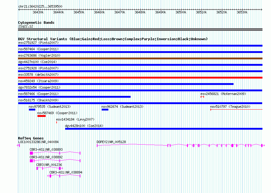 | | Variant Type | CNV gain | | Copy Number | | | Allele State | | | Allele Origin | | | Probe Count | | | Validation Flag | | | Merged Status | M | | Merged Variants | | | Supporting Variants | nssv673570, nssv683841, nssv662382, nssv691047, nssv684079, nssv666629 | | Samples | | | Known Genes | CBR3, CBR3-AS1, DOPEY2, LOC100133286 | | Method | SNP array | | Analysis | Sample-level CNVs | | Platform | GPL6434 | | Comments | | | Reference | Shaikh_et_al_2009 | | Pubmed ID | 19592680 | | Accession Number(s) | nsv516175