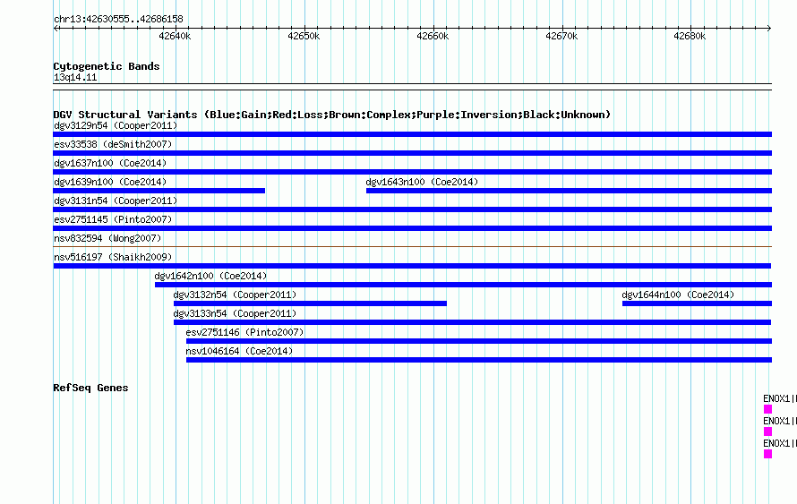 Variant DetailsVariant: nsv516197| Internal ID | 15443490 | | Landmark | | | Location Information | | | Cytoband | 13q14.11 | | Allele length | | Assembly | Allele length | | hg38 | 55604 | | hg19 | 55604 | | hg18 | 55604 | | hg17 | 55604 |