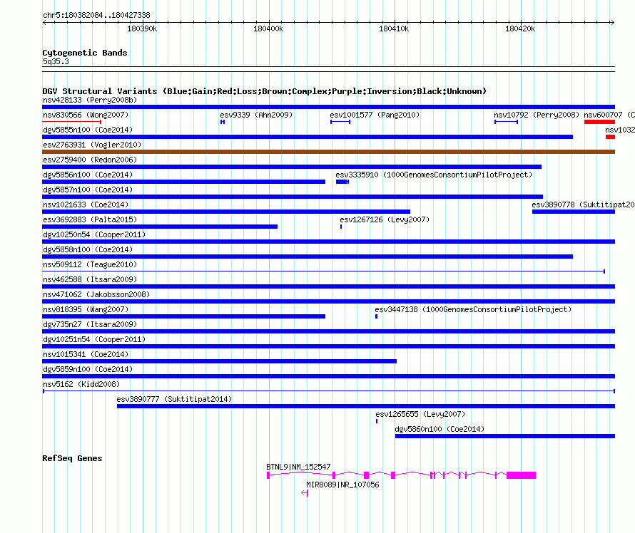 Variant DetailsVariant: nsv5162| Internal ID | 15549944 | | Landmark | | | Location Information | | | Cytoband | 5q35.3 | | Allele length | | Assembly | Allele length | | hg38 | 6980 | | hg19 | 6980 | | hg18 | 6980 | | hg17 | 6980 |