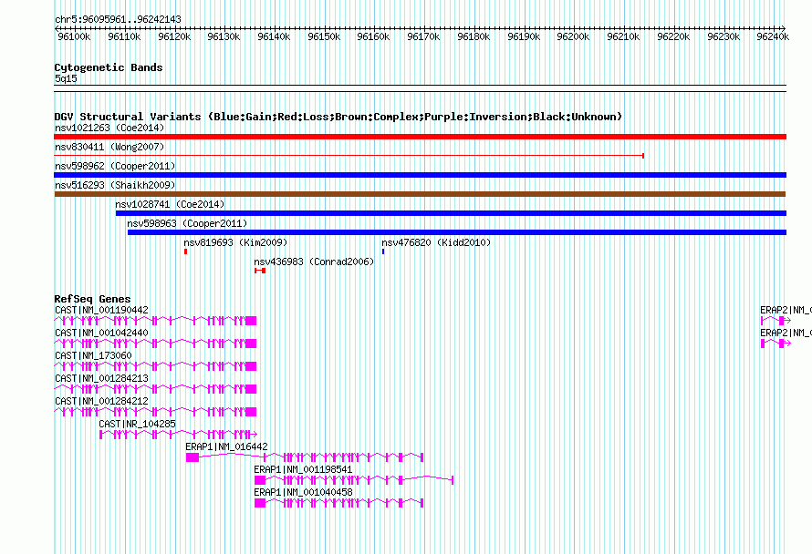 | Variant Type | CNV gain+loss | Copy Number | | Allele State | | Allele Origin | | Probe Count | | Validation Flag | | Merged Status | M | Merged Variants | | Supporting Variants | nssv667386, nssv673060, nssv700683 | Samples | | Known Genes | CAST, ERAP1, ERAP2 | Method | SNP array | Analysis | Sample-level CNVs | Platform | GPL6434 | Comments | | Reference | Shaikh_et_al_2009 | Pubmed ID | 19592680 | Accession Number(s) | nsv516293