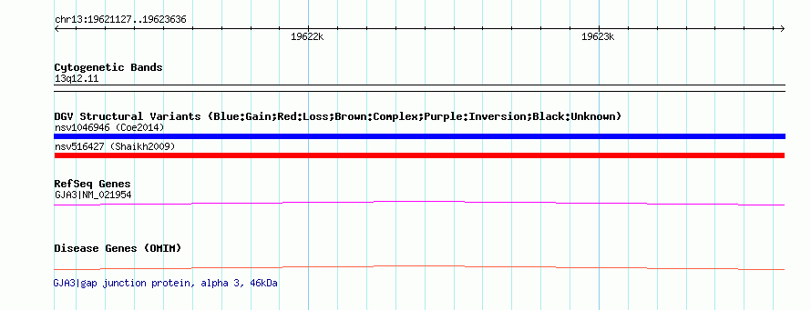 | Variant Type | CNV loss | Copy Number | | Allele State | | Allele Origin | | Probe Count | | Validation Flag | | Merged Status | M | Merged Variants | | Supporting Variants | nssv691416, nssv668305 | Samples | | Known Genes | GJA3 | Method | SNP array | Analysis | Sample-level CNVs | Platform | GPL6434 | Comments | | Reference | Shaikh_et_al_2009 | Pubmed ID | 19592680 | Accession Number(s) | nsv516427