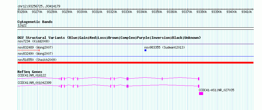 | | Variant Type | CNV loss | | Copy Number | | | Allele State | | | Allele Origin | | | Probe Count | | | Validation Flag | | | Merged Status | M | | Merged Variants | | | Supporting Variants | nssv658145, nssv669091 | | Samples | | | Known Genes | CCDC41, CCDC41-AS1 | | Method | SNP array | | Analysis | Sample-level CNVs | | Platform | GPL6434 | | Comments | | | Reference | Shaikh_et_al_2009 | | Pubmed ID | 19592680 | | Accession Number(s) | nsv516550