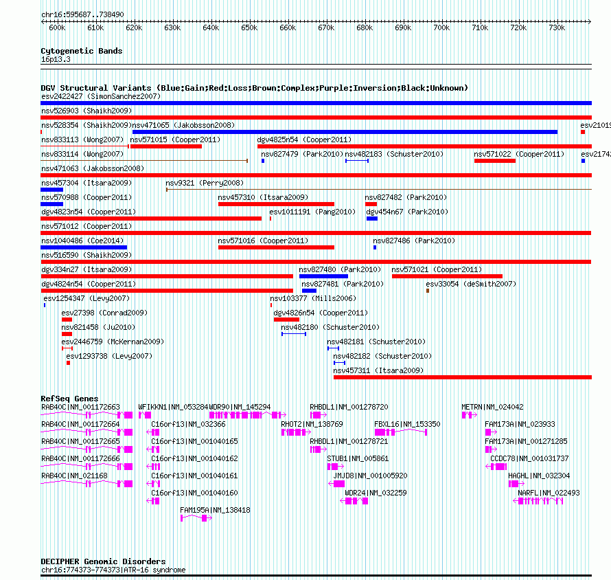 Variant DetailsVariant: nsv516590| Internal ID | 15097197 | | Landmark | | | Location Information | | | Cytoband | 16p13.3 | | Allele length | | Assembly | Allele length | | hg38 | 142804 | | hg19 | 142804 | | hg18 | 142804 | | hg17 | 142804 |