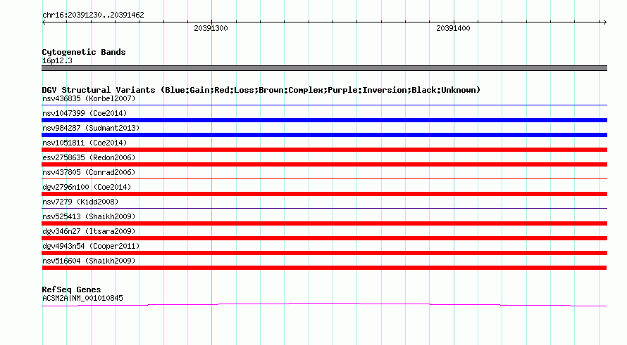 | | Variant Type | CNV loss | | Copy Number | | | Allele State | | | Allele Origin | | | Probe Count | | | Validation Flag | | | Merged Status | M | | Merged Variants | | | Supporting Variants | nssv676418, nssv669505 | | Samples | | | Known Genes | ACSM2A | | Method | SNP array | | Analysis | Sample-level CNVs | | Platform | GPL6434 | | Comments | | | Reference | Shaikh_et_al_2009 | | Pubmed ID | 19592680 | | Accession Number(s) | nsv516604