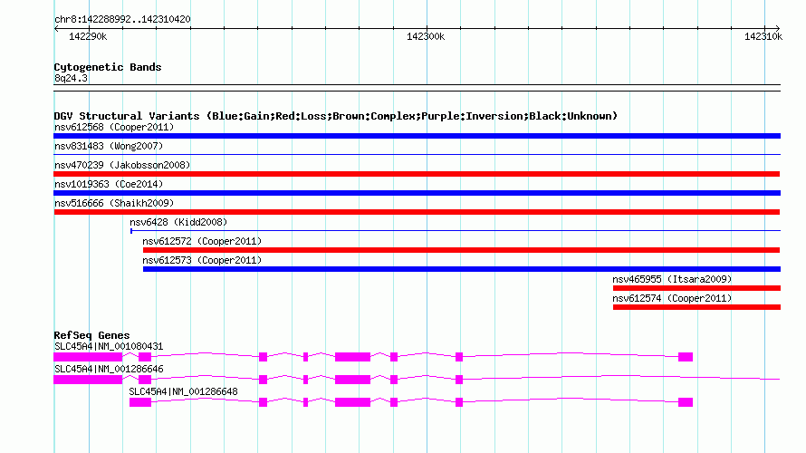 | | Variant Type | CNV loss | | Copy Number | | | Allele State | | | Allele Origin | | | Probe Count | | | Validation Flag | | | Merged Status | M | | Merged Variants | | | Supporting Variants | nssv656371, nssv671883, nssv670018, nssv693448 | | Samples | | | Known Genes | SLC45A4 | | Method | SNP array | | Analysis | Sample-level CNVs | | Platform | GPL6434 | | Comments | | | Reference | Shaikh_et_al_2009 | | Pubmed ID | 19592680 | | Accession Number(s) | nsv516666
