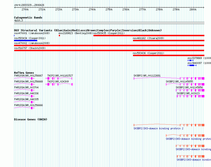 Variant DetailsVariant: nsv516797| Internal ID | 15444090 | | Landmark | | | Location Information | | | Cytoband | 4p16.3 | | Allele length | | Assembly | Allele length | | hg38 | 113098 | | hg19 | 113098 | | hg18 | 113098 | | hg17 | 112898 |