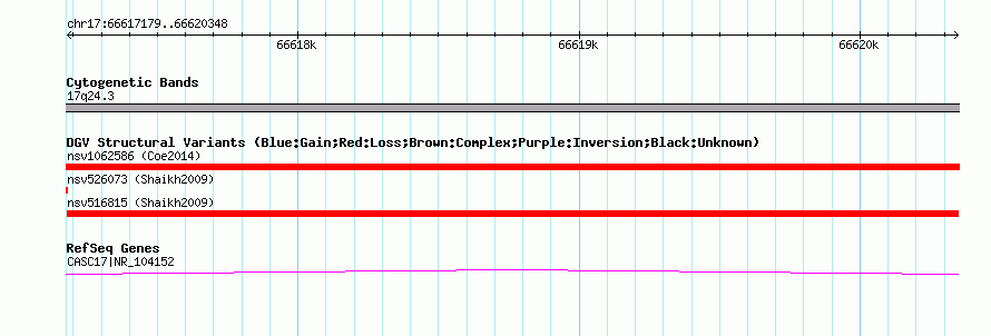 Variant DetailsVariant: nsv516815| Internal ID | 15444108 | | Landmark | | | Location Information | | | Cytoband | 17q24.3 | | Allele length | | Assembly | Allele length | | hg38 | 3170 | | hg19 | 3170 | | hg18 | 3170 | | hg17 | 3170 |