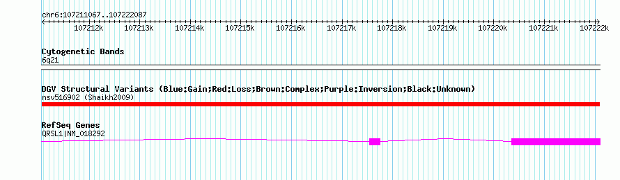 | | Variant Type | CNV loss | | Copy Number | | | Allele State | | | Allele Origin | | | Probe Count | | | Validation Flag | | | Merged Status | M | | Merged Variants | | | Supporting Variants | nssv654786, nssv676647, nssv678541, nssv692586, nssv682470 | | Samples | | | Known Genes | QRSL1 | | Method | SNP array | | Analysis | Sample-level CNVs | | Platform | GPL6434 | | Comments | | | Reference | Shaikh_et_al_2009 | | Pubmed ID | 19592680 | | Accession Number(s) | nsv516902