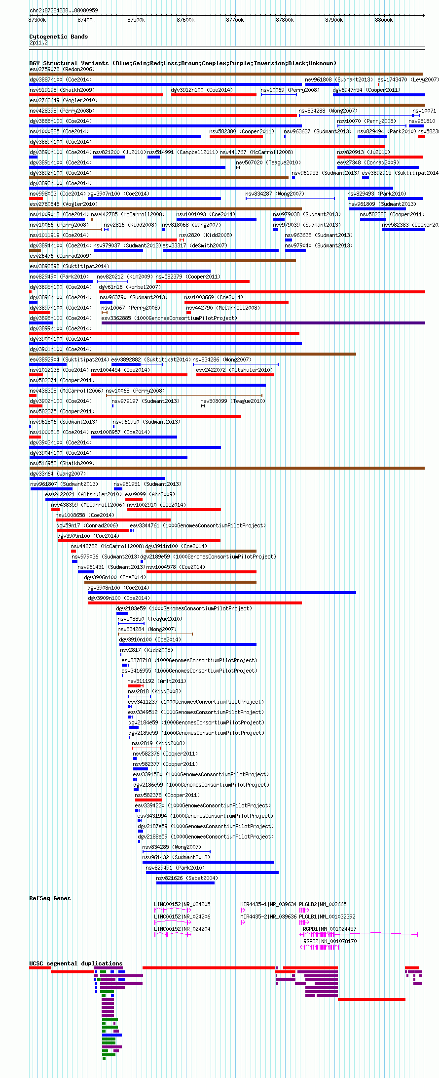 Variant DetailsVariant: nsv516958| Internal ID | 15097565 | | Landmark | | | Location Information | | | Cytoband | 2p11.2 | | Allele length | | Assembly | Allele length | | hg38 | 796722 | | hg19 | 869118 | | hg18 | 796722 | | hg17 | 796722 |