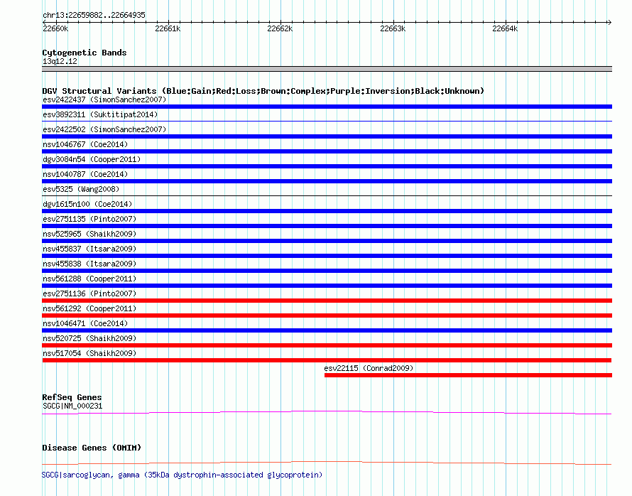 | | Variant Type | CNV loss | | Copy Number | | | Allele State | | | Allele Origin | | | Probe Count | | | Validation Flag | | | Merged Status | M | | Merged Variants | | | Supporting Variants | nssv689036, nssv666817, nssv658620, nssv653698 | | Samples | | | Known Genes | SGCG | | Method | SNP array | | Analysis | Sample-level CNVs | | Platform | GPL6434 | | Comments | | | Reference | Shaikh_et_al_2009 | | Pubmed ID | 19592680 | | Accession Number(s) | nsv517054