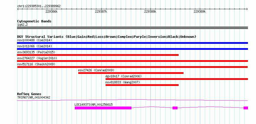 | | Variant Type | CNV loss | | Copy Number | | | Allele State | | | Allele Origin | | | Probe Count | | | Validation Flag | | | Merged Status | M | | Merged Variants | | | Supporting Variants | nssv672883, nssv674401, nssv657975, nssv652647, nssv653381, nssv665817, nssv689495, nssv673075, nssv689029, nssv656768, nssv659411, nssv659733, nssv666987, nssv684344, nssv664842, nssv653811, nssv663936, nssv663273, nssv672611, nssv652884, nssv683876 | | Samples | | | Known Genes | LOC149373, TRIM67 | | Method | SNP array | | Analysis | Sample-level CNVs | | Platform | GPL6434 | | Comments | | | Reference | Shaikh_et_al_2009 | | Pubmed ID | 19592680 | | Accession Number(s) | nsv517116