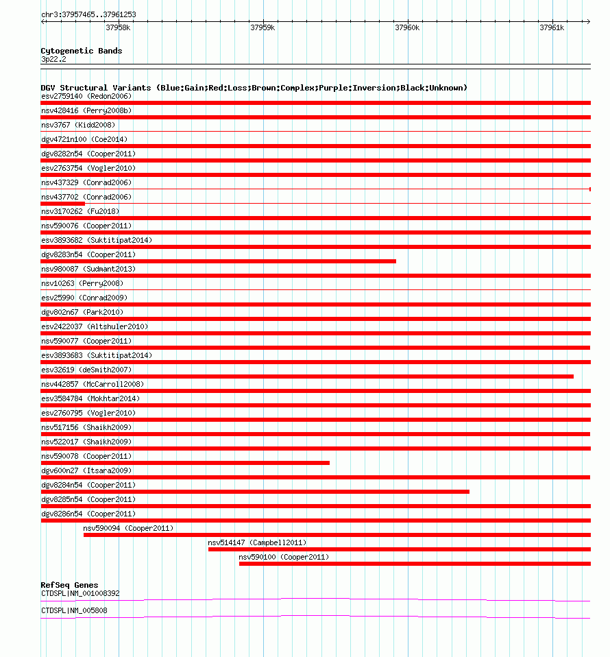 | | Variant Type | CNV loss | | Copy Number | | | Allele State | | | Allele Origin | | | Probe Count | | | Validation Flag | | | Merged Status | M | | Merged Variants | | | Supporting Variants | nssv654361, nssv690647, nssv660492, nssv692675, nssv688865, nssv686919, nssv673225, nssv655454, nssv678461, nssv693996, nssv670075, nssv687246, nssv693608, nssv664531, nssv668775, nssv654245, nssv693641, nssv656733, nssv684625, nssv657669, nssv668957, nssv659370, nssv657776, nssv673282, nssv659133, nssv661154, nssv677067, nssv659249, nssv683264, nssv669068, nssv682963, nssv660252, nssv669904, nssv686361, nssv654848, nssv690999, nssv670694, nssv668704, nssv675858, nssv692430, nssv659597, nssv688581, nssv652252, nssv672534, nssv653889, nssv691356, nssv686684, nssv667882, nssv676158, nssv652777, nssv675472, nssv675508, nssv664633, nssv663968, nssv658788, nssv690512, nssv669852, nssv681288, nssv657552, nssv667730, nssv689184, nssv680800, nssv663604, nssv672379, nssv692407, nssv660401, nssv676555, nssv672160 | | Samples | | | Known Genes | CTDSPL | | Method | SNP array | | Analysis | Sample-level CNVs | | Platform | GPL6434 | | Comments | | | Reference | Shaikh_et_al_2009 | | Pubmed ID | 19592680 | | Accession Number(s) | nsv517156