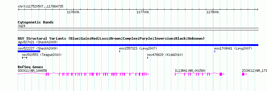 | | Variant Type | CNV gain | | Copy Number | | | Allele State | | | Allele Origin | | | Probe Count | | | Validation Flag | | | Merged Status | M | | Merged Variants | dgv527n21 | | Supporting Variants | nssv703547, nssv702657, nssv686476, nssv687684, nssv705250, nssv654146 | | Samples | | | Known Genes | DOCK11, IL13RA1, ZCCHC12 | | Method | SNP array | | Analysis | Sample-level CNVs | | Platform | GPL6434 | | Comments | | | Reference | Shaikh_et_al_2009 | | Pubmed ID | 19592680 | | Accession Number(s) | nsv517257