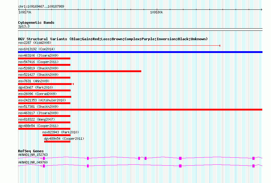 | | Variant Type | CNV loss | | Copy Number | | | Allele State | | | Allele Origin | | | Probe Count | | | Validation Flag | | | Merged Status | M | | Merged Variants | | | Supporting Variants | nssv668325, nssv654880, nssv684418, nssv677315, nssv675068, nssv693128, nssv680313, nssv677839, nssv654981, nssv692506, nssv651861, nssv687426, nssv669266, nssv654796, nssv667589, nssv678932, nssv677956, nssv691765, nssv688606, nssv699178, nssv685328, nssv686059, nssv680529, nssv668838, nssv659552, nssv706005, nssv655959 | | Samples | | | Known Genes | AKNAD1 | | Method | SNP array | | Analysis | Sample-level CNVs | | Platform | GPL6434 | | Comments | | | Reference | Shaikh_et_al_2009 | | Pubmed ID | 19592680 | | Accession Number(s) | nsv517381