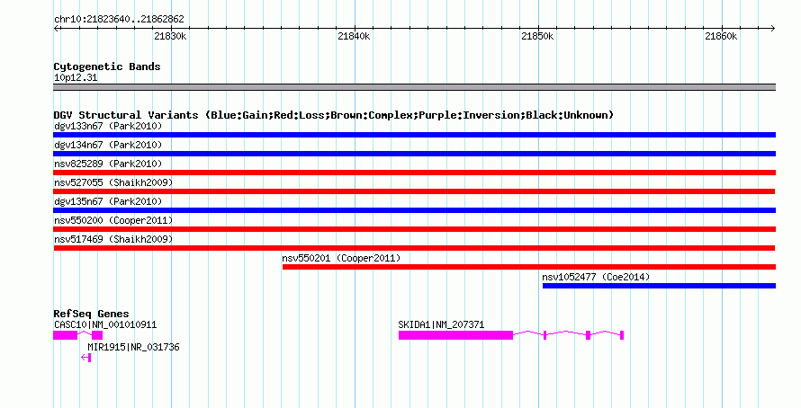 | | Variant Type | CNV loss | | Copy Number | | | Allele State | | | Allele Origin | | | Probe Count | | | Validation Flag | | | Merged Status | M | | Merged Variants | | | Supporting Variants | nssv684817, nssv689498, nssv677688, nssv658409, nssv664604, nssv652113 | | Samples | | | Known Genes | CASC10, MIR1915, SKIDA1 | | Method | SNP array | | Analysis | Sample-level CNVs | | Platform | GPL6434 | | Comments | | | Reference | Shaikh_et_al_2009 | | Pubmed ID | 19592680 | | Accession Number(s) | nsv517469