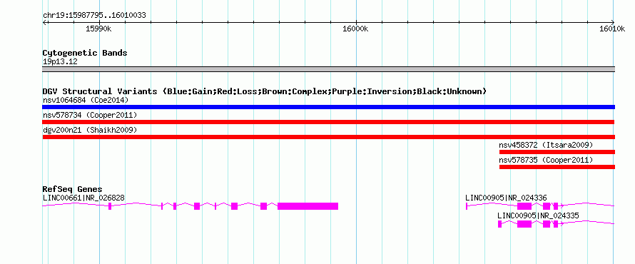 Variant DetailsVariant: nsv517514Internal ID | 15098121 | Landmark | | Location Information | | Cytoband | 19p13.12 | Allele length | Assembly | Allele length | hg38 | 22239 | hg19 | 22239 | hg18 | 22239 | hg17 | 22239 |