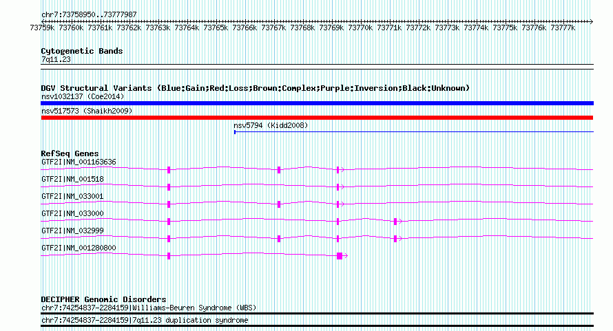 | | Variant Type | CNV loss | | Copy Number | | | Allele State | | | Allele Origin | | | Probe Count | | | Validation Flag | | | Merged Status | M | | Merged Variants | | | Supporting Variants | nssv686989, nssv654052, nssv674225, nssv651852, nssv685151, nssv683847, nssv665719, nssv654129, nssv687384, nssv664661, nssv662669, nssv662347, nssv687016 | | Samples | | | Known Genes | GTF2I | | Method | SNP array | | Analysis | Sample-level CNVs | | Platform | GPL6434 | | Comments | | | Reference | Shaikh_et_al_2009 | | Pubmed ID | 19592680 | | Accession Number(s) | nsv517573