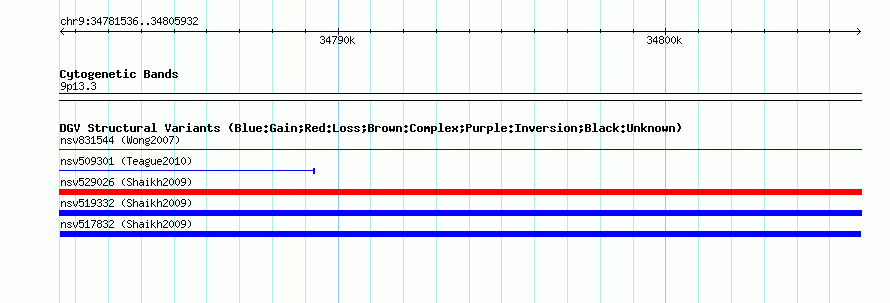 Variant DetailsVariant: nsv517832| Internal ID | 15445125 | | Landmark | | | Location Information | | | Cytoband | 9p13.3 | | Allele length | | Assembly | Allele length | | hg38 | 24397 | | hg19 | 24397 | | hg18 | 24397 | | hg17 | 24397 |