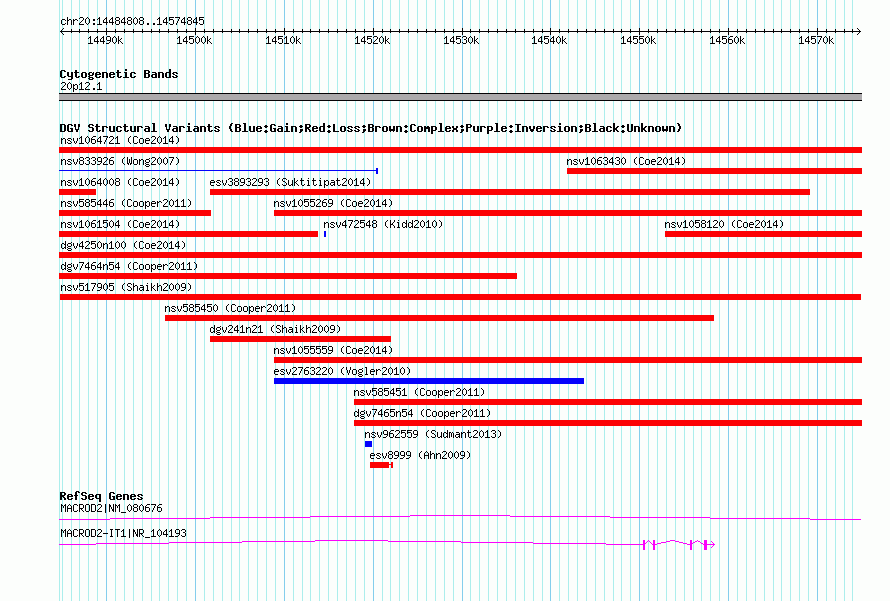 | Variant Type | CNV loss | Copy Number | | Allele State | | Allele Origin | | Probe Count | | Validation Flag | | Merged Status | M | Merged Variants | | Supporting Variants | nssv695316 | Samples | | Known Genes | MACROD2, MACROD2-IT1 | Method | SNP array | Analysis | Sample-level CNVs | Platform | GPL6434 | Comments | | Reference | Shaikh_et_al_2009 | Pubmed ID | 19592680 | Accession Number(s) | nsv517905