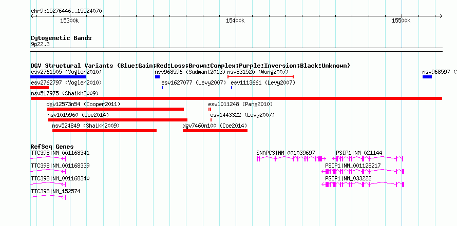 | | Variant Type | CNV loss | | Copy Number | | | Allele State | | | Allele Origin | | | Probe Count | | | Validation Flag | | | Merged Status | M | | Merged Variants | | | Supporting Variants | nssv695387 | | Samples | | | Known Genes | PSIP1, SNAPC3, TTC39B | | Method | SNP array | | Analysis | Sample-level CNVs | | Platform | GPL6434 | | Comments | | | Reference | Shaikh_et_al_2009 | | Pubmed ID | 19592680 | | Accession Number(s) | nsv517975