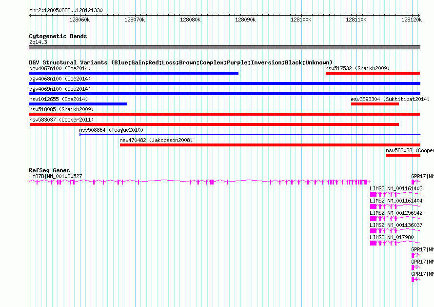 | | Variant Type | CNV loss | | Copy Number | | | Allele State | | | Allele Origin | | | Probe Count | | | Validation Flag | | | Merged Status | M | | Merged Variants | | | Supporting Variants | nssv695499 | | Samples | | | Known Genes | GPR17, LIMS2, MYO7B | | Method | SNP array | | Analysis | Sample-level CNVs | | Platform | GPL6434 | | Comments | | | Reference | Shaikh_et_al_2009 | | Pubmed ID | 19592680 | | Accession Number(s) | nsv518085