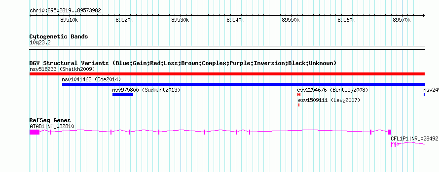 Variant DetailsVariant: nsv518233| Internal ID | 15445526 | | Landmark | | | Location Information | | | Cytoband | 10q23.2 | | Allele length | | Assembly | Allele length | | hg38 | 71164 | | hg19 | 71164 | | hg18 | 71164 | | hg17 | 71164 |