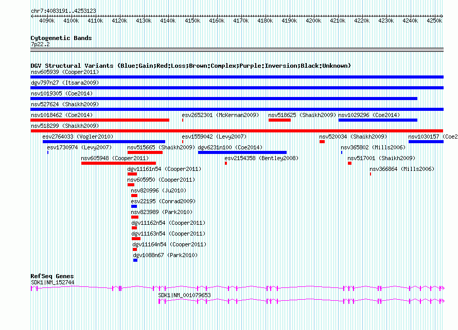 | Variant Type | CNV loss | Copy Number | | Allele State | | Allele Origin | | Probe Count | | Validation Flag | | Merged Status | M | Merged Variants | | Supporting Variants | nssv695730 | Samples | | Known Genes | SDK1 | Method | SNP array | Analysis | Sample-level CNVs | Platform | GPL6434 | Comments | | Reference | Shaikh_et_al_2009 | Pubmed ID | 19592680 | Accession Number(s) | nsv518299