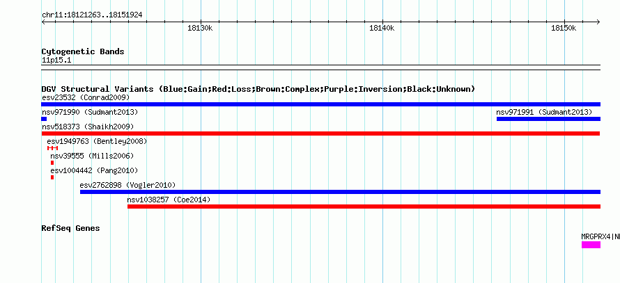 Variant DetailsVariant: nsv518373| Internal ID | 15445666 | | Landmark | | | Location Information | | | Cytoband | 11p15.1 | | Allele length | | Assembly | Allele length | | hg38 | 30662 | | hg19 | 30662 | | hg18 | 30662 | | hg17 | 30662 |