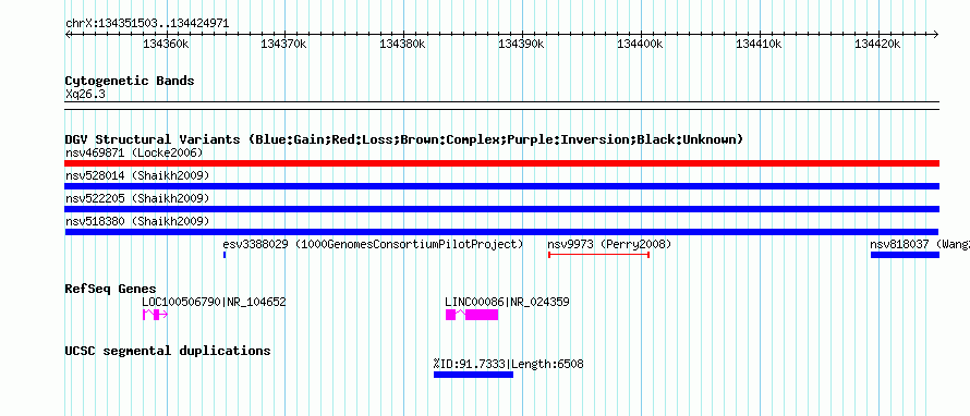 Variant DetailsVariant: nsv518380Internal ID | 15098987 | Landmark | | Location Information | | Cytoband | Xq26.3 | Allele length | Assembly | Allele length | hg38 | 73469 | hg19 | 73469 | hg18 | 73469 | hg17 | 73469 |