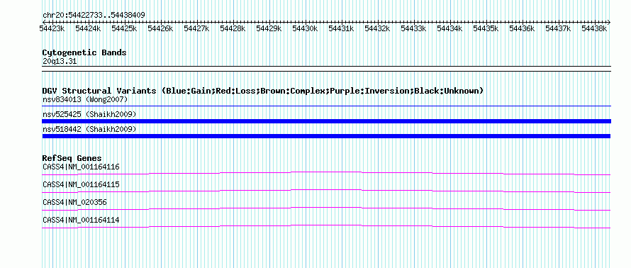 | | Variant Type | CNV gain | | Copy Number | | | Allele State | | | Allele Origin | | | Probe Count | | | Validation Flag | | | Merged Status | M | | Merged Variants | | | Supporting Variants | nssv694237 | | Samples | | | Known Genes | CASS4 | | Method | SNP array | | Analysis | Sample-level CNVs | | Platform | GPL6434 | | Comments | | | Reference | Shaikh_et_al_2009 | | Pubmed ID | 19592680 | | Accession Number(s) | nsv518442