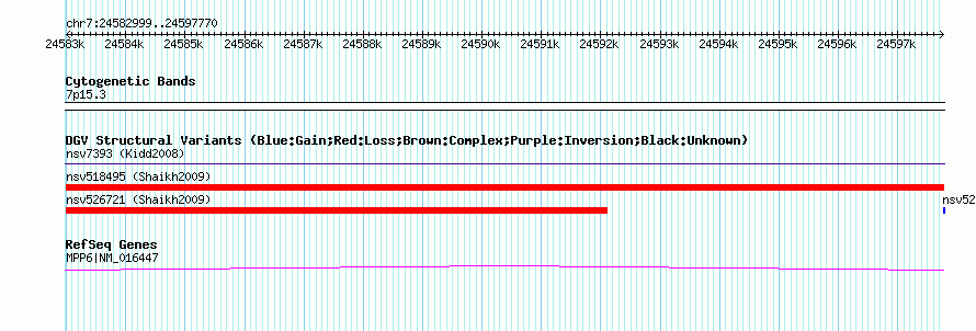 Variant DetailsVariant: nsv518495| Internal ID | 15445788 | | Landmark | | | Location Information | | | Cytoband | 7p15.3 | | Allele length | | Assembly | Allele length | | hg38 | 14772 | | hg19 | 14772 | | hg18 | 14772 | | hg17 | 14772 |