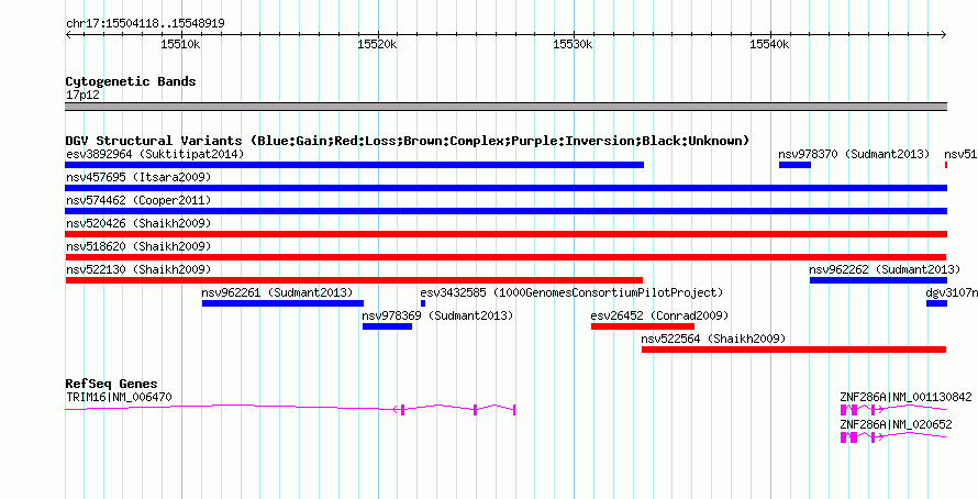 Variant DetailsVariant: nsv518620| Internal ID | 15445913 | | Landmark | | | Location Information | | | Cytoband | 17p12 | | Allele length | | Assembly | Allele length | | hg38 | 44802 | | hg19 | 44802 | | hg18 | 44802 | | hg17 | 44802 |