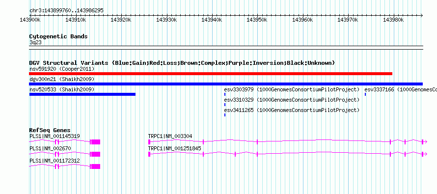 | Variant Type | CNV gain | Copy Number | | Allele State | | Allele Origin | | Probe Count | | Validation Flag | | Merged Status | M | Merged Variants | dgv300n21 | Supporting Variants | nssv696071 | Samples | | Known Genes | PLS1, TRPC1 | Method | SNP array | Analysis | Sample-level CNVs | Platform | GPL6434 | Comments | | Reference | Shaikh_et_al_2009 | Pubmed ID | 19592680 | Accession Number(s) | nsv518623