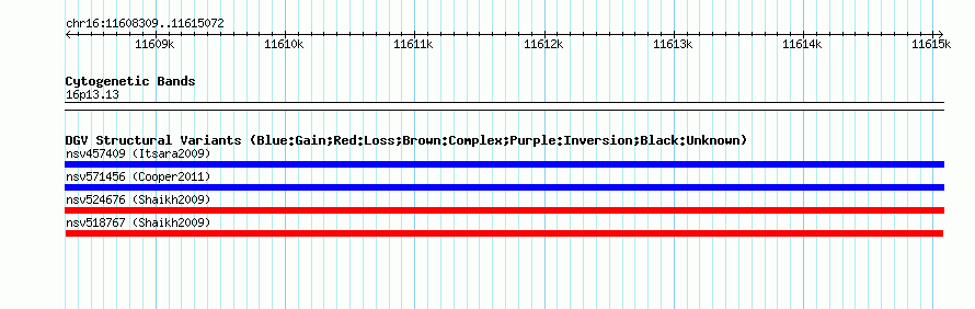 Variant DetailsVariant: nsv518767| Internal ID | 15446060 | | Landmark | | | Location Information | | | Cytoband | 16p13.13 | | Allele length | | Assembly | Allele length | | hg38 | 6764 | | hg19 | 6764 | | hg18 | 6764 | | hg17 | 6764 |