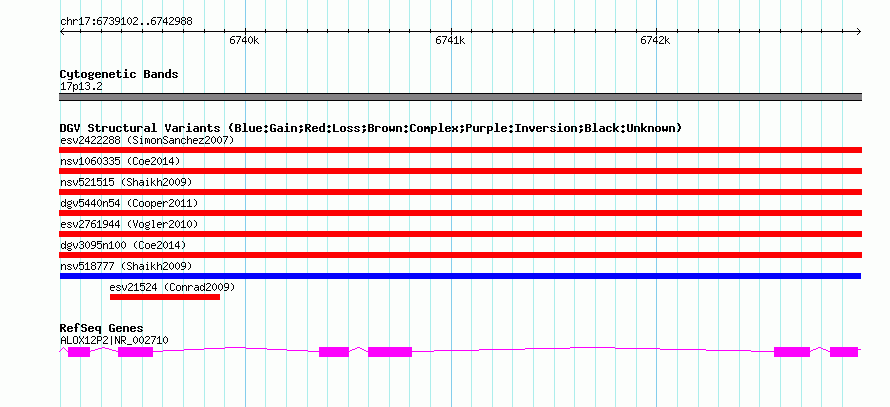 Variant DetailsVariant: nsv518777| Internal ID | 15099384 | | Landmark | | | Location Information | | | Cytoband | 17p13.1 | | Allele length | | Assembly | Allele length | | hg38 | 3887 | | hg19 | 3887 | | hg18 | 3887 | | hg17 | 3887 |