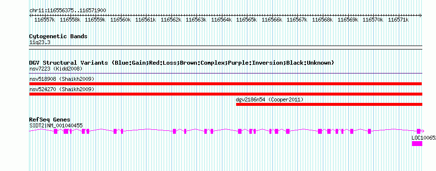 | | Variant Type | CNV loss | | Copy Number | | | Allele State | | | Allele Origin | | | Probe Count | | | Validation Flag | | | Merged Status | M | | Merged Variants | | | Supporting Variants | nssv696368 | | Samples | | | Known Genes | LOC100652768, SIDT2 | | Method | SNP array | | Analysis | Sample-level CNVs | | Platform | GPL6434 | | Comments | | | Reference | Shaikh_et_al_2009 | | Pubmed ID | 19592680 | | Accession Number(s) | nsv518908