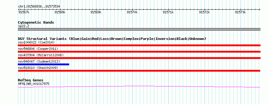 Variant DetailsVariant: nsv519110| Internal ID | 15446403 | | Landmark | | | Location Information | | | Cytoband | 1p22.2 | | Allele length | | Assembly | Allele length | | hg38 | 6699 | | hg19 | 6699 | | hg18 | 6699 | | hg17 | 6699 |