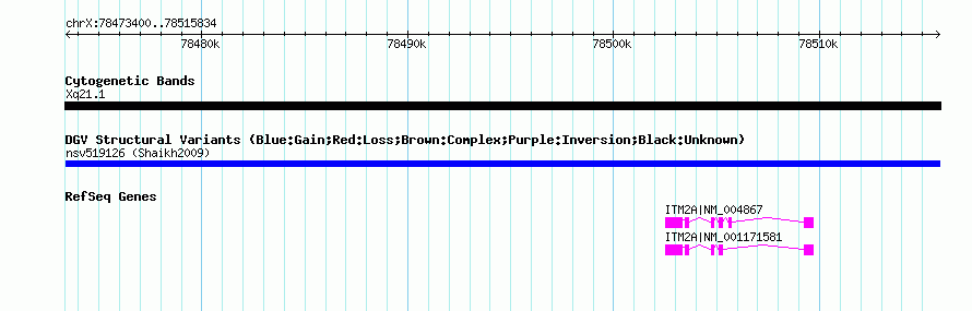 Variant DetailsVariant: nsv519126| Internal ID | 15446419 | | Landmark | | | Location Information | | | Cytoband | Xq21.1 | | Allele length | | Assembly | Allele length | | hg38 | 42435 | | hg19 | 42435 | | hg18 | 42435 | | hg17 | 42435 |