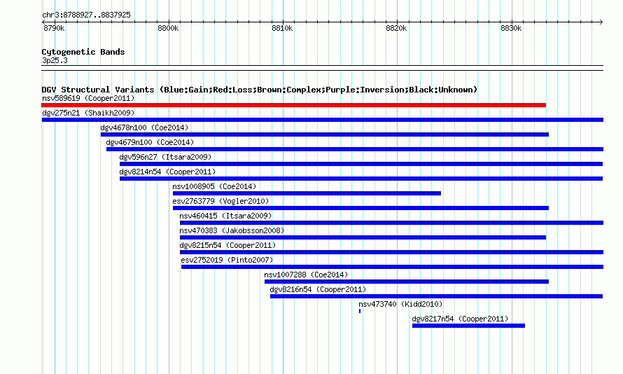 Variant DetailsVariant: nsv519145| Internal ID | 15099752 | | Landmark | | | Location Information | | | Cytoband | 3p25.3 | | Allele length | | Assembly | Allele length | | hg38 | 48999 | | hg19 | 48999 | | hg18 | 48999 | | hg17 | 48999 |