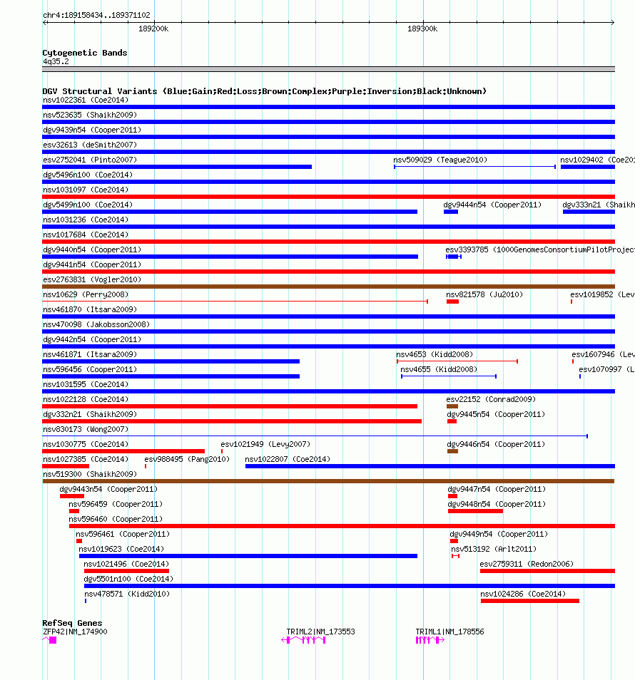 | Variant Type | CNV gain+loss | Copy Number | | Allele State | | Allele Origin | | Probe Count | | Validation Flag | | Merged Status | M | Merged Variants | | Supporting Variants | nssv663679, nssv696256, nssv655244, nssv699315, nssv680541, nssv656925, nssv696505, nssv699576, nssv697630 | Samples | | Known Genes | TRIML1, TRIML2, ZFP42 | Method | SNP array | Analysis | Sample-level CNVs | Platform | GPL6434 | Comments | | Reference | Shaikh_et_al_2009 | Pubmed ID | 19592680 | Accession Number(s) | nsv519300