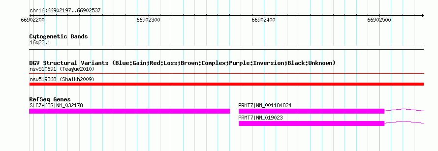 Variant DetailsVariant: nsv519368| Internal ID | 15446661 | | Landmark | | | Location Information | | | Cytoband | 16q22.1 | | Allele length | | Assembly | Allele length | | hg38 | 341 | | hg19 | 341 | | hg18 | 341 | | hg17 | 341 |