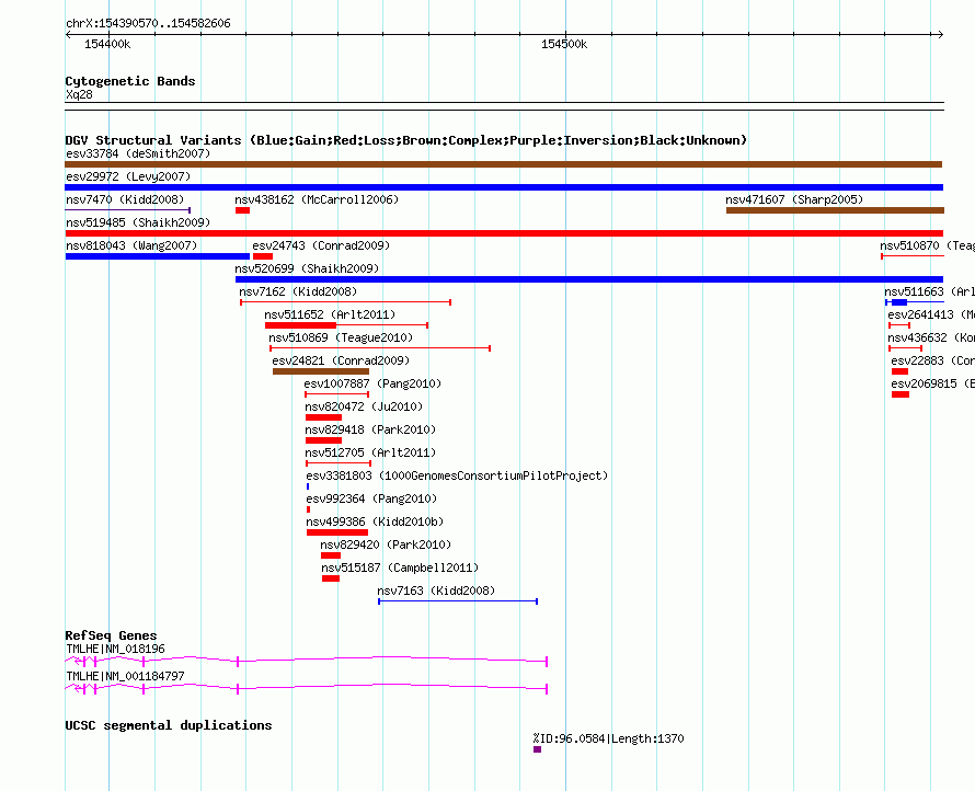| Variant Type | CNV loss | Copy Number | | Allele State | | Allele Origin | | Probe Count | | Validation Flag | | Merged Status | M | Merged Variants | | Supporting Variants | nssv696877 | Samples | | Known Genes | TMLHE | Method | SNP array | Analysis | Sample-level CNVs | Platform | GPL6434 | Comments | | Reference | Shaikh_et_al_2009 | Pubmed ID | 19592680 | Accession Number(s) | nsv519485