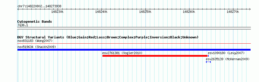 Variant DetailsVariant: nsv519634| Internal ID | 15446927 | | Landmark | | | Location Information | | | Cytoband | 7q36.1 | | Allele length | | Assembly | Allele length | | hg38 | 53137 | | hg19 | 53137 | | hg18 | 53137 | | hg17 | 53137 |