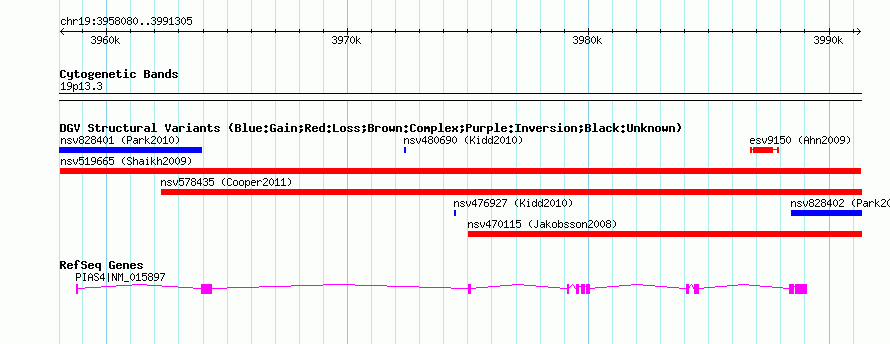 Variant DetailsVariant: nsv519665| Internal ID | 15446958 | | Landmark | | | Location Information | | | Cytoband | 19p13.3 | | Allele length | | Assembly | Allele length | | hg38 | 33226 | | hg19 | 33226 | | hg18 | 33226 | | hg17 | 33226 |
