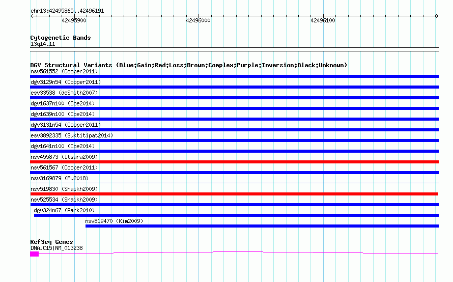 Variant DetailsVariant: nsv519830| Internal ID | 15447123 | | Landmark | | | Location Information | | | Cytoband | 13q14.11 | | Allele length | | Assembly | Allele length | | hg38 | 327 | | hg19 | 327 | | hg18 | 327 | | hg17 | 327 |