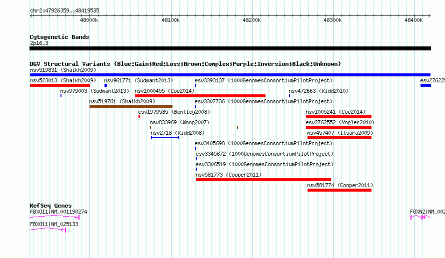 Variant DetailsVariant: nsv519831| Internal ID | 15100438 | | Landmark | | | Location Information | | | Cytoband | 2p16.3 | | Allele length | | Assembly | Allele length | | hg38 | 493177 | | hg19 | 493177 | | hg18 | 493177 | | hg17 | 493177 |