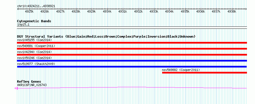 Variant DetailsVariant: nsv519977| Internal ID | 15447270 | | Landmark | | | Location Information | | | Cytoband | 10p15.1 | | Allele length | | Assembly | Allele length | | hg38 | 14711 | | hg19 | 14711 | | hg18 | 14711 | | hg17 | 14711 |