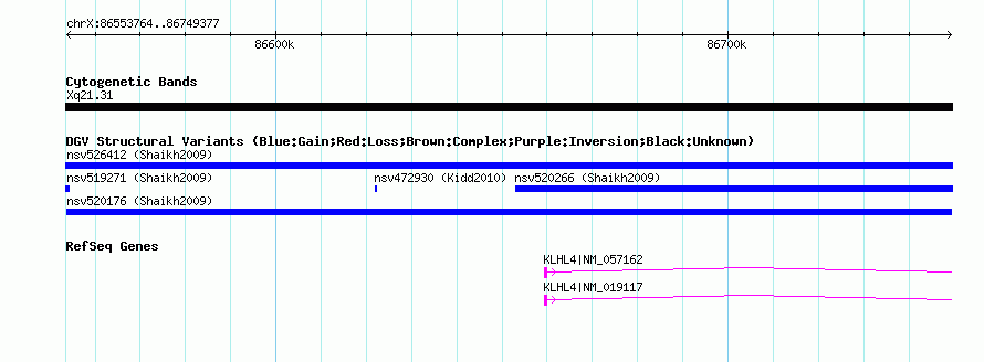 Variant DetailsVariant: nsv520176| Internal ID | 15447469 | | Landmark | | | Location Information | | | Cytoband | Xq21.31 | | Allele length | | Assembly | Allele length | | hg38 | 195614 | | hg19 | 195614 | | hg18 | 195614 | | hg17 | 195614 |